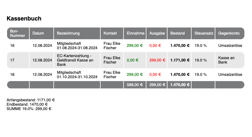 Am Ende des Tages wird der Bargeldbestand in der Kasse gezählt. Dieser Betrag wird mit dem Soll-Bestand verglichen, der sich aus den Einnahmen und Ausgaben des Tages ergibt.