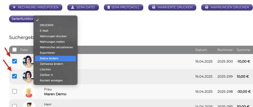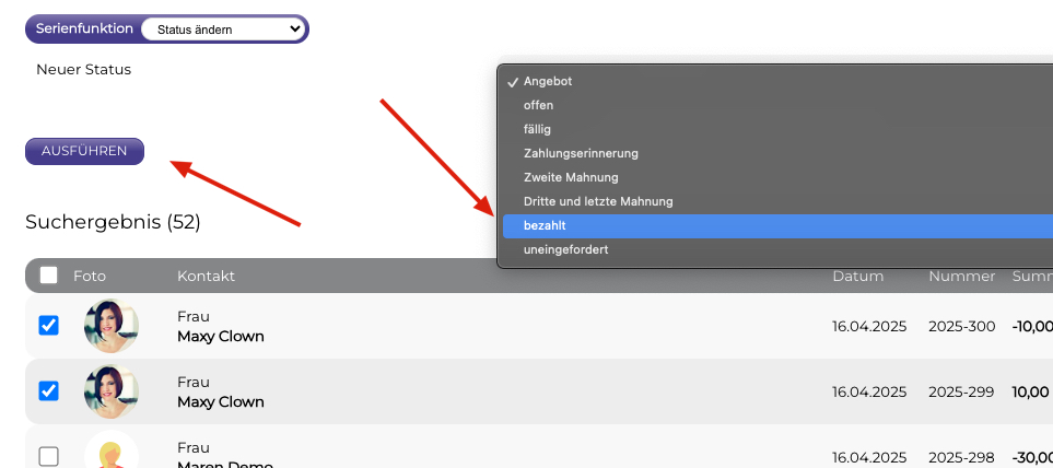 Nachdem die neue Stornorechnung gespeichert wurde, setzt du diese erst auf fällig. Nun kann der Status der Ursprungsrechnung und der Stornorechnung auf „bezahlt“ geändert werden. Dies kannst du in den Rechnungen selbst oder über die Serienfunktion ändern.
