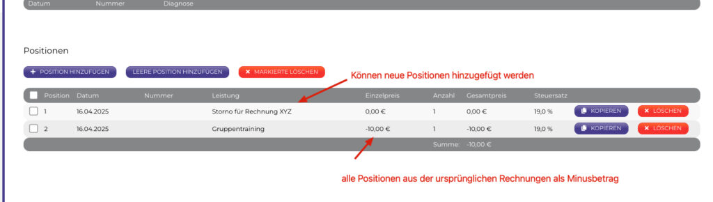 Daraufhin wird eine neue Rechnung mit den Minusbeiträgen aus der Stornierten Rechnung erstellt. dort kannst du auch noch weitere Positionen oder Notizen in der Rechnung hinzufügen.